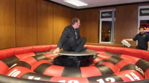 Below is a picture of a slightly bemused bouncy roulette operator in a room that looks far too small for such an activity. The twat in the suit is myself.