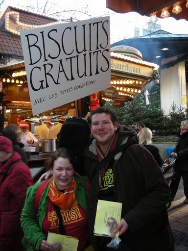 Helen and Olly trying to give away free biscuits in the Luxembourg Christmas market, but mainly making an exhibition of themselves instead.