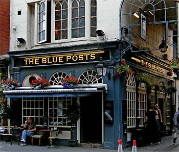 Blue Posts are so named (I am led to believe) because the original actual blue posts marked the limits of the hunting ground which Soho was during olden times.