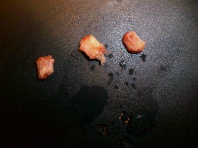 As well as the above picture of the finished necklace, Tam kindly included photos of the process prior to completion. Because I don’t want to make casual browsers puke till next Tuesday, you’ll have to click through if you wish to see Tam’s foot pre-surgery, her blood-soaked post-operative appendage, or her disembodied toe-knuckles.